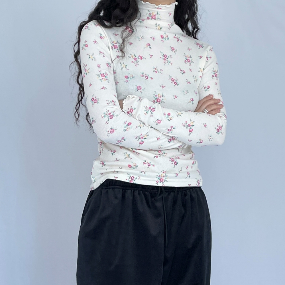 잔꽃 목폴라 골지 티셔츠